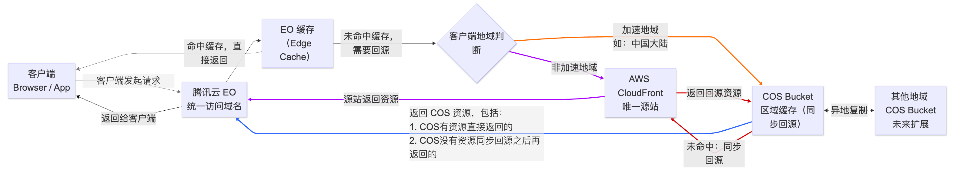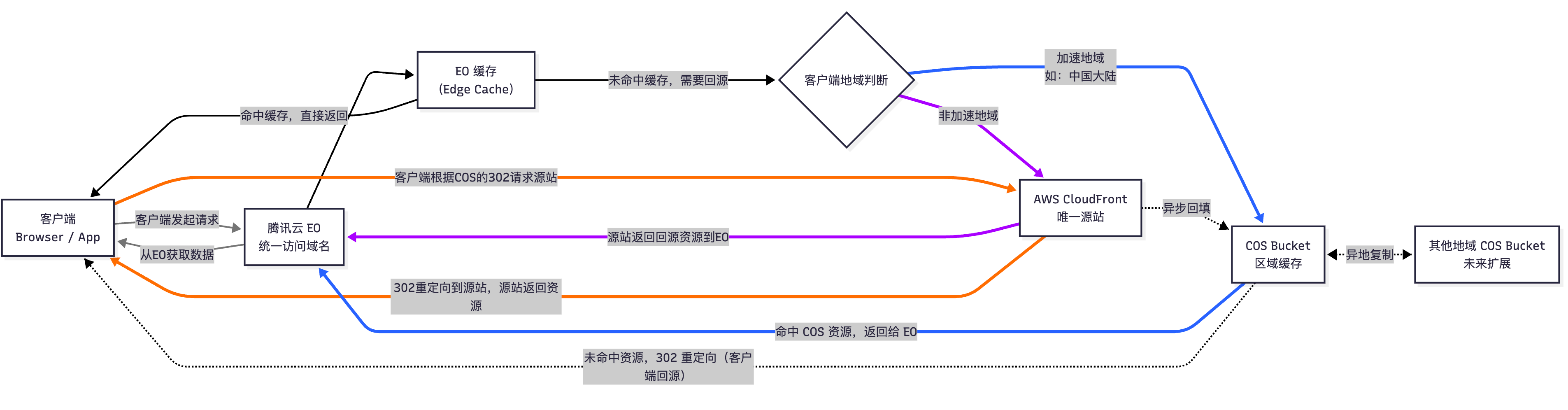 - 异步回源 + 302 重定向:COS 向客户端返回 302,将请求重定向至 CloudFront 源站,同时在后台异步拉取资源存入 COS