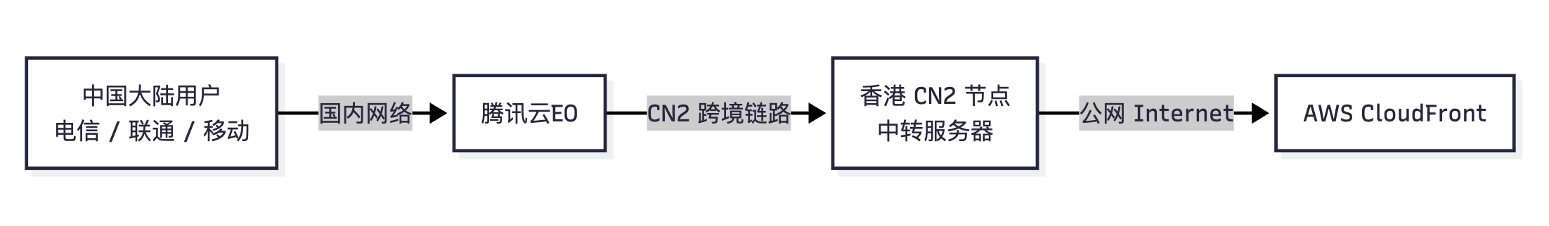 在香港部署一台中转服务器,将 EO 的回源地址指向该节点,由节点再转发到海外源站。大陆到香港的链路经过 CN2 优化,质量大幅提升,回源成功率明显改善。