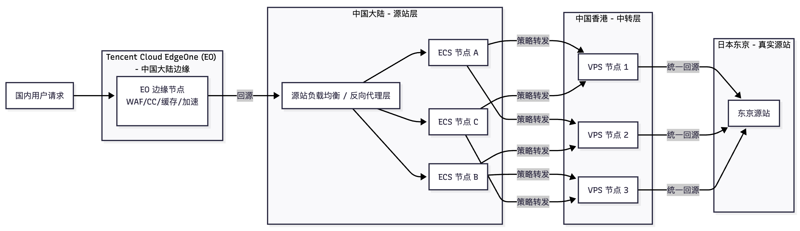 为保障可用性,广州层和香港层均部署了多个节点,由负载均衡层分发流量;香港的多个 VPS 节点再统一回源日本东京的真实源站。这种多节点冗余的设计,使得单个节点故障不会影响整体可用性。
